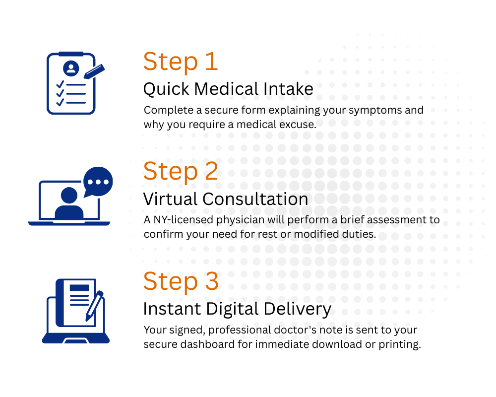 Need medical documentation for work or school? Speak with a NY-licensed doctor today for a professional evaluation and receive your digital note instantly.